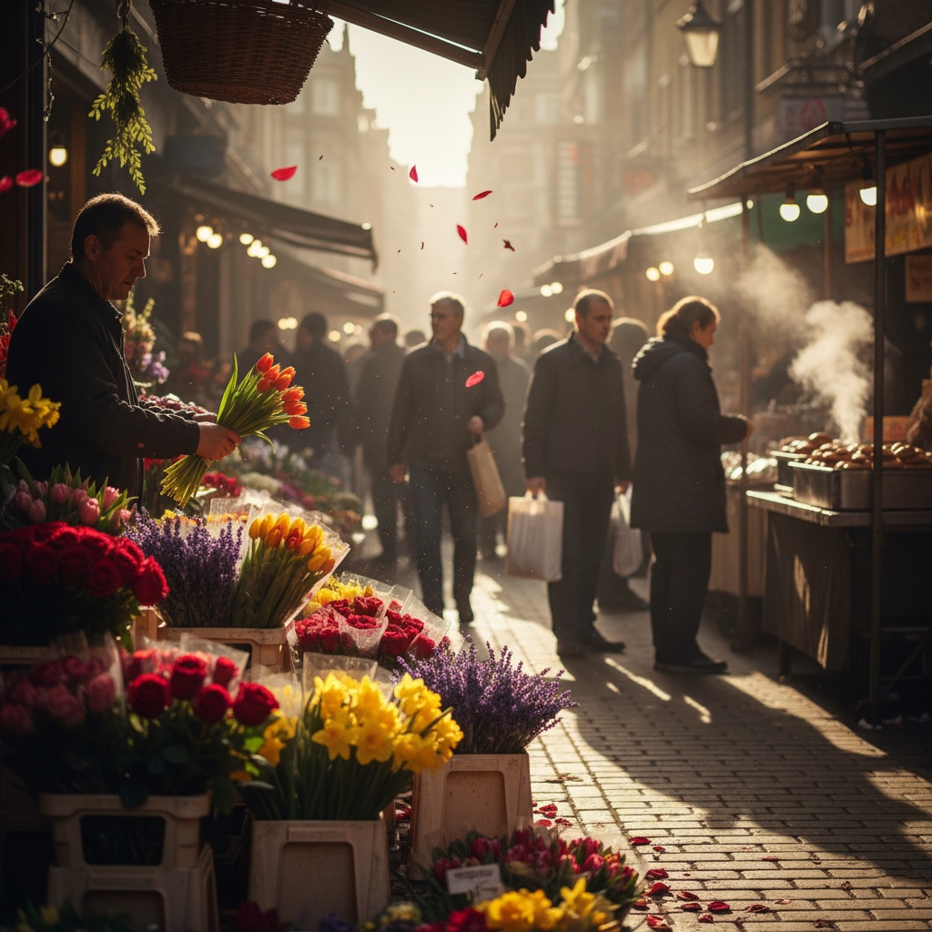 Amidst the lively chatter and enticing aromas of a London market, a florist meticulously arranges a fresh bouquet of tulips. The air is thick with the sweet fragrance of blooming flowers, occasionally punctuated by the savory steam wafting from a nearby food stall. Passersby, a blur of motion, add to the energetic atmosphere.