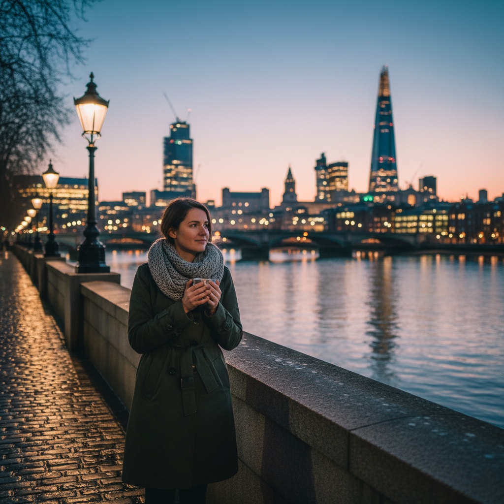 As evening descends peacefully over the Thames, a woman stands contemplatively, her warm drink clutched in her hands. The city lights begin to shimmer across the water, casting a serene glow that contrasts with the daytime hustle. This tranquil moment offers a pause, a chance to reflect on the city’s ceaseless rhythm.