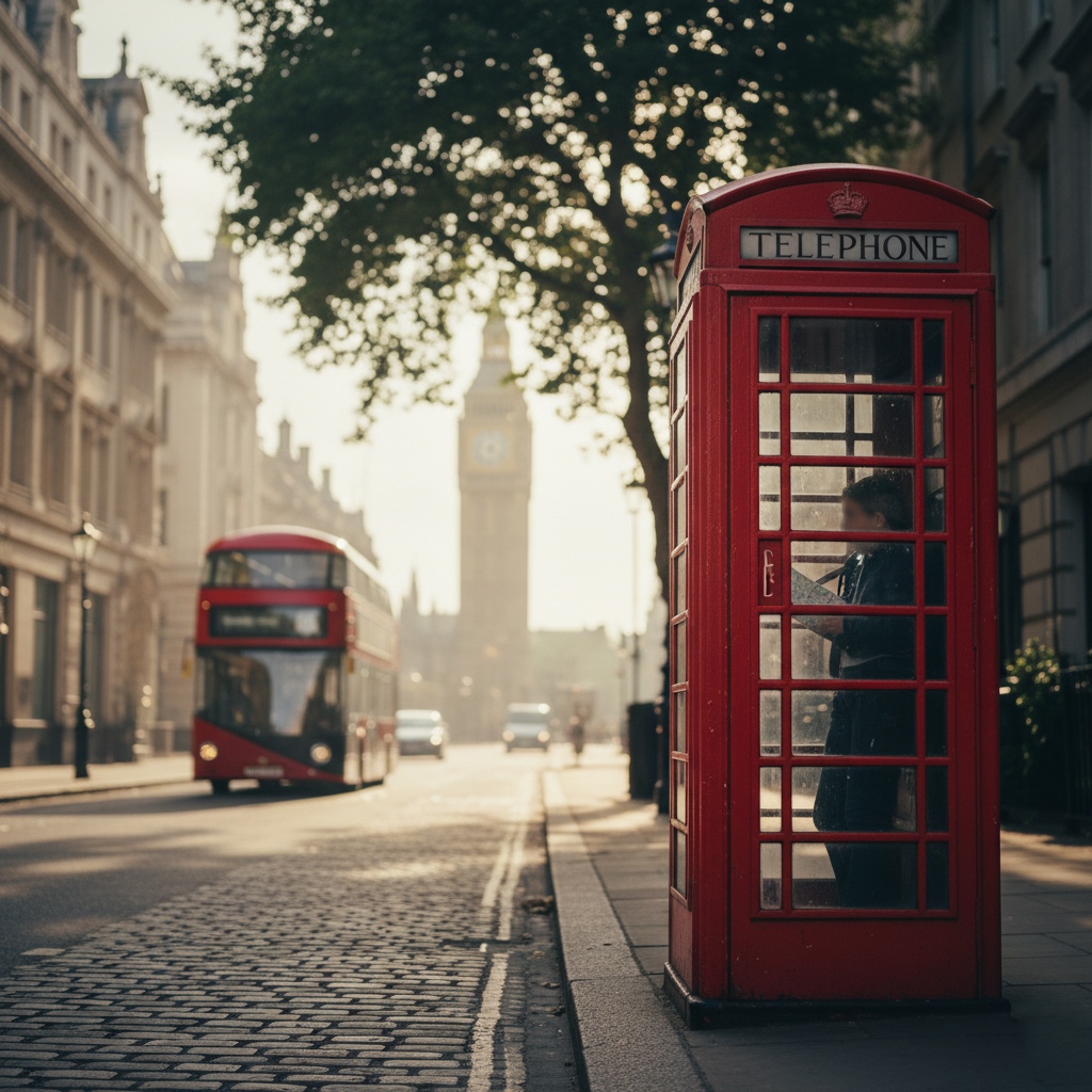 A quintessentially British scene unfolds as the morning sun gently illuminates a vibrant red phone box. Though largely replaced by mobile phones, it stands proudly as a symbol of London’s rich history, providing a striking contrast against the pale, historic buildings that line the street. The distant silhouette of Big Ben hints at the bustling city just beyond.